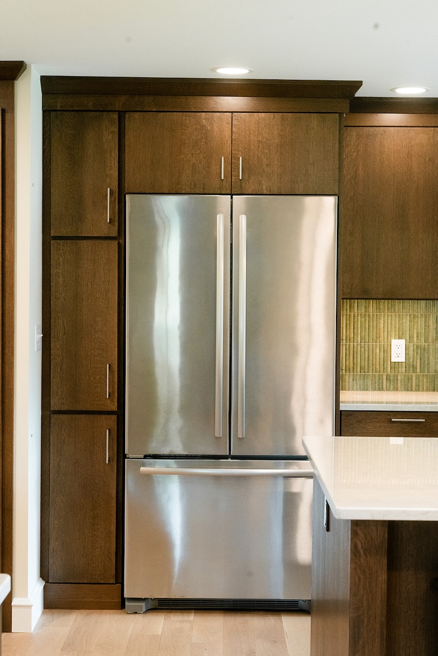 By stacking a pantry pullout and tray divider next to the refrigerator, the design team was able to add generous storage without overwhelming the wall. This approach preserved prep space on both sides of the range, supporting efficient cooking and movement throughout the kitchen.