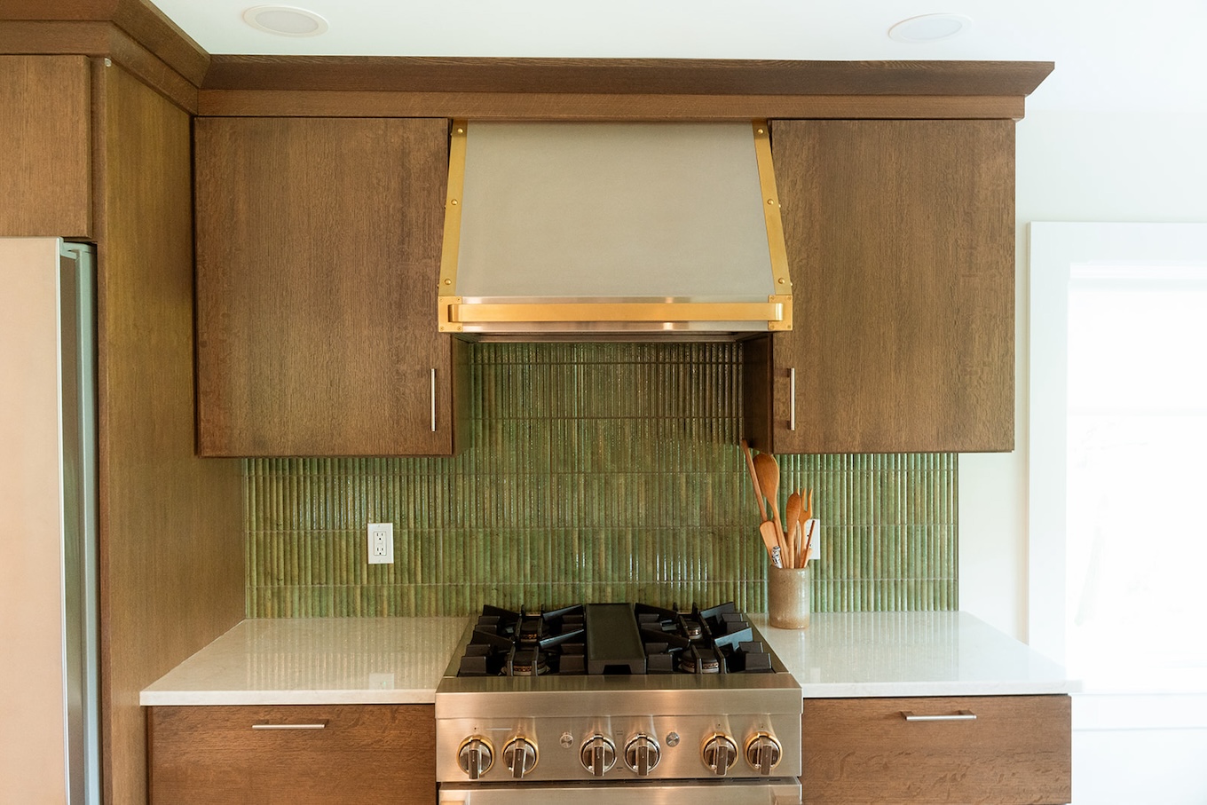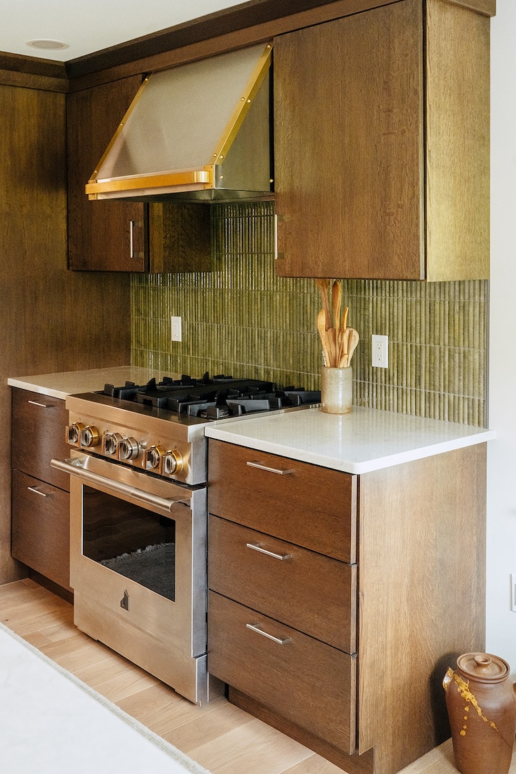 The Simple Slab cabinetry door style features Tawny stain on quartersawn white oak to introduce warmth and natural texture. Viatera Soprano quartz countertops offer durability and subtle elegance, while reeded glass doors add visual interest without disrupting the kitchen’s minimalist design.